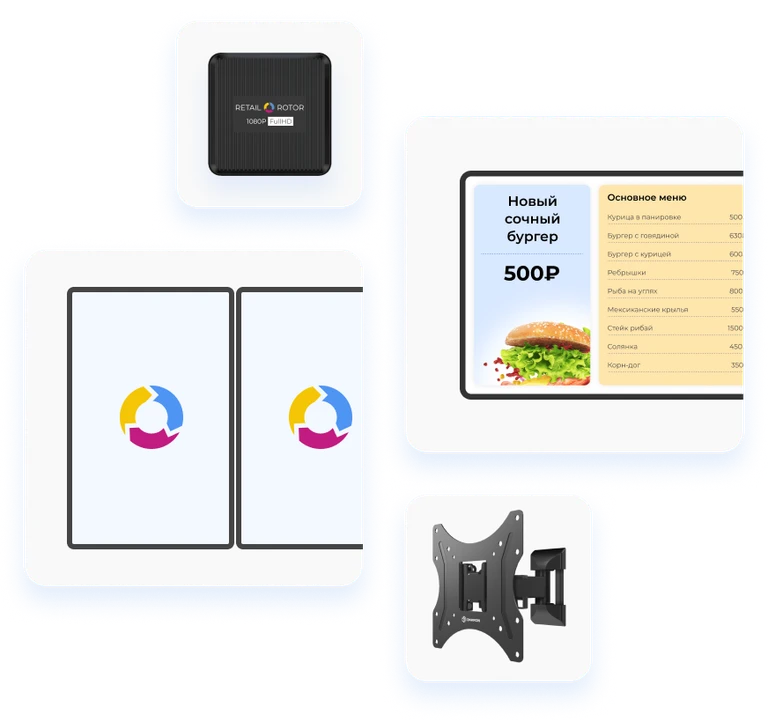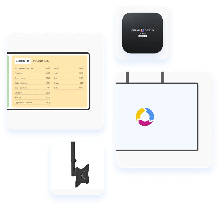 Предоставим комплект с экранами, креплениями, медиаплеером и подпиской на систему управления контентом.